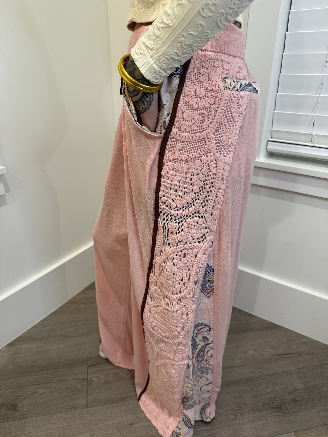 Elevate your wardrobe with the POL 30A-19 pants, featuring a stunning spring paisley pattern and delicate lace detailing. These unique pants not only showcase your individuality but also offer a chic, comfortable fit that turns heads. Embrace your style and express yourself with every step!