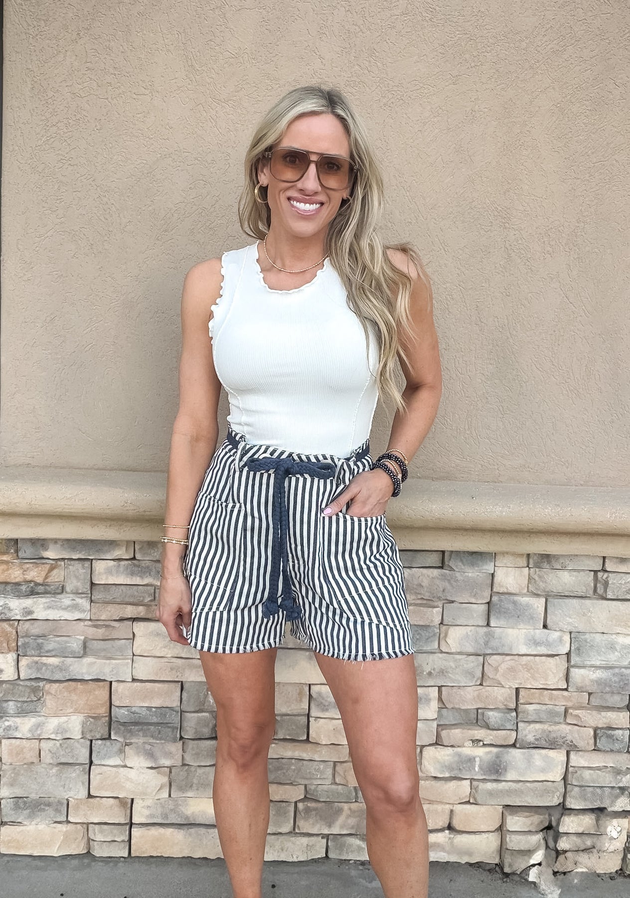 Meet your new warm-weather staple. The Harbor Stripe Rope Shorts feature a classic navy-and-white stripe pattern with a playful rope drawstring that adds the perfect touch of coastal charm. Designed with front utility pockets and a raw-edge hem, these shorts blend relaxed comfort with effortless style. Lightweight, easy, and endlessly wearable—perfect for lake days, beach walks, or casual weekend outfits.